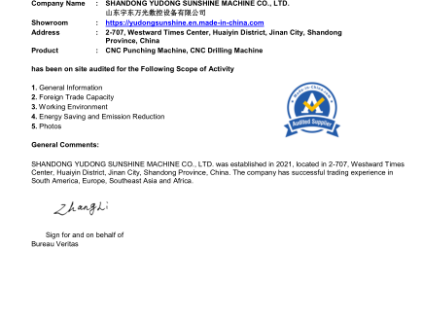 Audited Supplier presented to Shandong Yudong Sunshine Machine Co., Ltd. In Recognition of your site Existence & Business Operations
